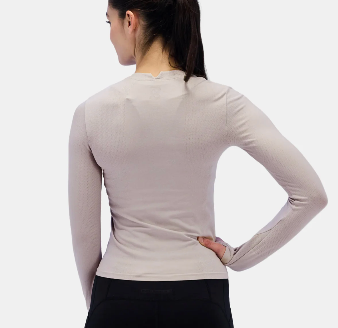 Esta silueta sin costuras está tejida con hilos que crean una sensación duradera y suave al tacto, con gestión de la humedad y secado rápido. Además, la fibra de carbono tejida en toda la prenda ayuda a regular la temperatura corporal, además de tener propiedades antiestáticas y antimicrobianas.